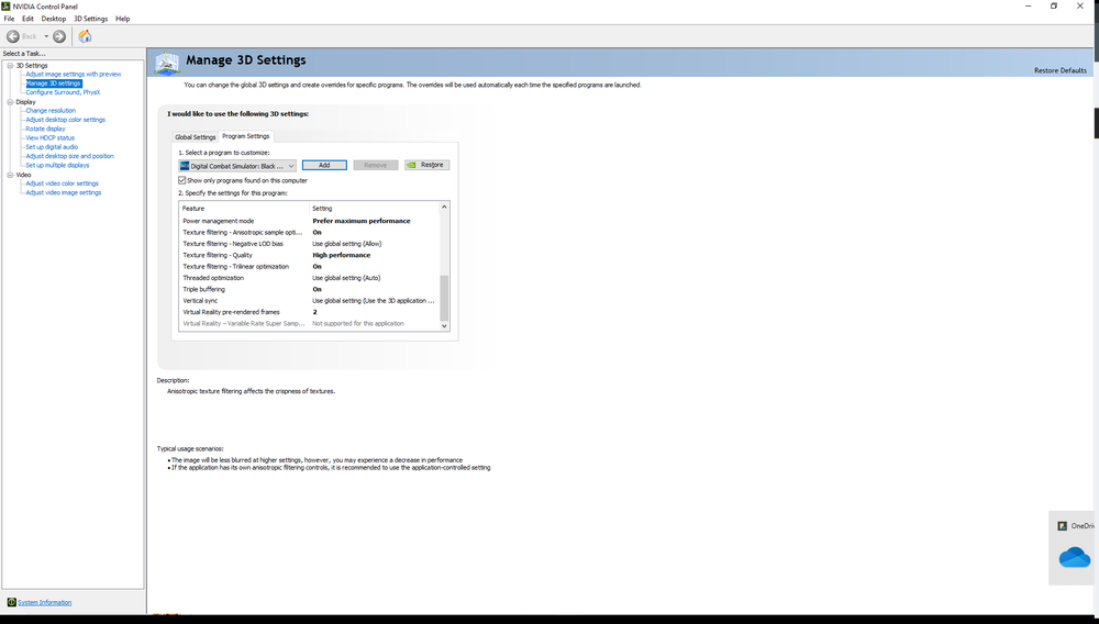 So i have seen so many forums about this problem but I'm gonna ask anyway. While playing DCS with minimal graphics settings I can get massive FPS drops. I'm able to fix these FPS drops by turning off my VR headset for about 10 sec and then turn it back on and with about 1/3rd of the time the FPS is fixed back to normal. If the FPS isn't fixed I turn the headset off and on again until it is fixed again. Every time I have one of these FPS drops I noticed that in task manager my GPU usage goes from giving 70% to DCS and 30% to my VR application > to 30% DCS and 70% to my VR application. I have noticed that this problem occurs more frequently in busy servers where there are a lot of players or a lot of enemy moving AI. But it isn't constant on these busy servers. I can just fly a little bit longer than normal until I get this FPS drop. I also have days where I play on a full Growling sidewinder PVP (for an hour) server and I never get any FPS drops. I have already tried several things: In Nvidia control panel I put power management for DCS only in to 'Prefer maximum power' and of the VR oculus application to 'Optimal power' In windows settings enable 'Hardware-accelerated GPU scheduling' and as well put in Graphics performance preference DCS in high performance I don't know any other possible fixes i can do. I've attached a video showing the FPS drop. You can visibly see when it starts to lag and as well as see at the same time the GPU usage of DCS drop [note that when i stopped recording i turned off and on my VR headset for ~10 sec and the FPS went back to normal as well as the GPU usage went back to 60/70ish %] Digital Combat Simulator Black Shark.mp4