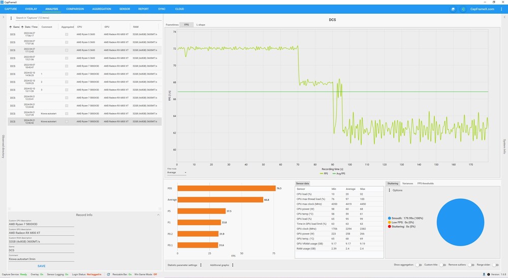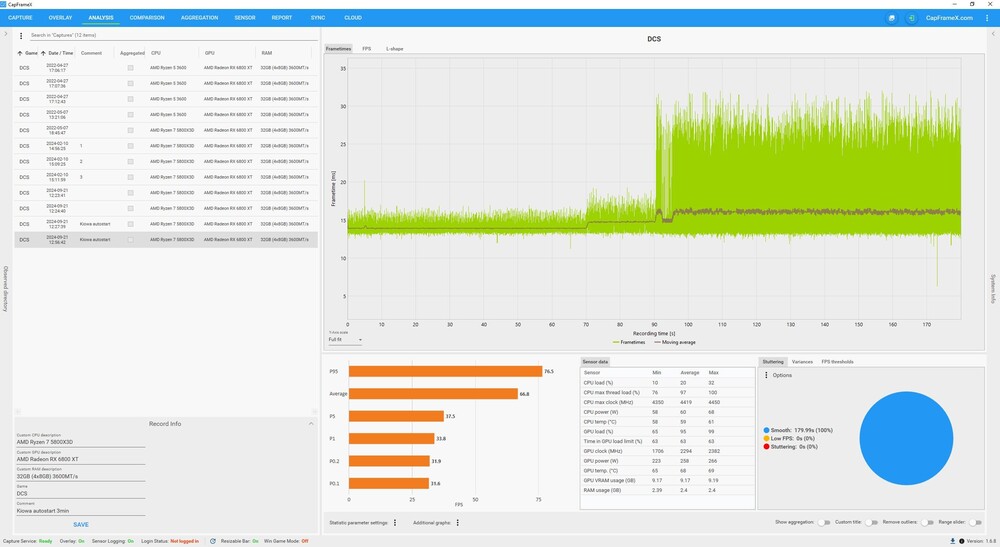 VR performance in the OH-85D is unacceptable. I have pretty much every module in DCS and play all in VR with almost always 72 FPS in both SP and MP. As soon as the rotor starts spinning FPS goes from a stable 72 to 62-60 with very high frametimes (Please see attached CapeframeX with both frametime and FPS) Explanation of capeframeX: I am looking straight forward during the full 3 min Empty mission on Syria.(no other assets) Using autostart first stage in framtime is cold and dark. Second stage is when I press autostart. Third stage is when the rotor starts spinning. Worth noting: If I center my view in VR with my head outside of the aircraft I have a stable 72 fps. MMS is not on. I have also attached my track file + my options. Hardware: Quest 3 AMD 6800XT AMD 5800X3D 32GB RAM M.2 SSD LastMissionTrack.trk options.lua