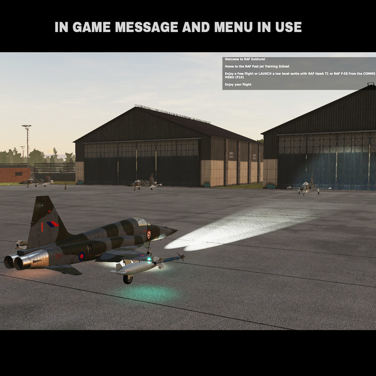 RAF Sukhumi - Airbase MOD - puts you right in the heart of a modern day RAF fast jet training base right here in Caucasus Map of DCS World. Sitting on the coastline Sukhumi airfield has been extensively upgraded via VPC MOD to host RAF Hawk T1, RAF F-5E, RAF L-39 and RAF F/A-18C squadrons. Use this mission as a base for training or LAUNCH one of two Low Level Training Sorties with a pair of RAF F-5E’s or Hawk T1 via COMMS F10 MENU. Blast off from a foggy, atmospheric sunrise at RAF Sukhumi in this fast and exciting mission - similar to my earlier Low Level Sortie with RAF Tornado - DCS MISSION The F-5E has been used here in DCS as it is similar to the Bae Hawk T2 which is currently used by the RAF to qualify its fast jet pilots before they move onto frontline squadrons and operate aircraft like the EUROFIGHTER TYPHOON or F-35. Take in the amazing lakes, rivers, valleys and mountains of the Caucasus Map in DCS as you maintain formation in this thrilling and exciting low level flying training mission lead by RAF F-5E fast jet trainers. Point to point, tactical, low level aviation and navigation with real comms from your flight lead as he guides you around this awesome route. Visit the local low level flying area AKA The Kutaisi Loop, a series of tight, winding valleys similar to The Mach Loop training area in the UK. This mission gives you a full and enhanced DCS flying experience and includes ON SCREEN MESSAGES, COMMUNICATION MENU ITEMS and CUSTOM PILOT AUDIO WELCOME TO RAF SUKHUMI - Upgrades include... • Upgraded Tower • Squadron apron and hangars • Squadron aircraft and liveries. • Base support vehicles • Fire station • Visiting Aircraft • Cold War Aviation Museum • BUNDLED PDF with links to MODs/skins & install instructions Available Aircraft Slots (Players) • RAF F-5E - 29 Sqn (x4) • RAF L-29C - 208 Sqn (x2) • RAF F/A-18C - XIII Sqn (x3) Support: Single Player and Multiplayer Easy and fun for beginner and pro alike Mission Time: Around 40 mins FEATURES: - HOT START AIRCRAFT - CUSTOM AUDIO FROM LEAD PILOT (229 AM - Pre-tuned in aircraft) WARNING - AUDIO/ON SCREEN MESSAGES!!! Make sure HELMET AUDIO VOLUME is turned up ON-SCREEN MESSAGES and COMMUNICATIONS MENU (F10) USED THROUGHOUT MISSION!!! I will update this mission to iron out any bugs or to add more functionality Cheers and all the best for the holidays Stevie Thanks