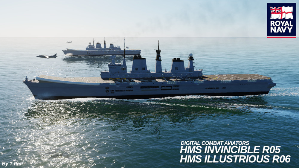 HMS INVINCIBLE & HMS Illustrious V1.3 Mod Release! ( 19/01/2021 ) - UPDATED UPDATE Changelog V1.3 : - Re-worked modelling on HMS Invincible - Brand-new Seadart Model and launcher - (Launcher will receive further fixing in next update) - Deck signs and writting added - Ship R05 Insignia added to Island - Fixed Hull and added red base - Corrected Encyclopedia (Thanks Joey45) - Added Themes (Thanks Ozone1) V1.2 - Only update to Illustrious - Extensive re-work of deck and ambience lighting on HMS Illustrious - Re-modelled surfaces - Crest and Insignia added - Animation updates HMS Invincible R05 (1982) and HMS Illustrious R06 (2012) ! What works : - Lights , however they remain mostly on during the day as well (Have not been able to animate the time of day change yet) - AI Takeoff and Landing (testsed with 3 AI - Ski jump will not work with them though due to DCS bug.They attempt it but usually crash in sea) - Radar Animation What doesn't work : - Lights , however they remain mostly on during the day as well - Elevator animations - No working defensive weapons yet (to be added to next update) All textures are base textures used for the modelling. Proper textures are being made now and will be added to next update . Some parts of the ship might seem better made than others , this is because this ship was my learning project so as I progressed I modelled better. All will be addressed in upcoming updates however due to work and time , I will doing best I can . Afterall , Razbam's South Atlantic map and assets should be releasing with this year ! You can download the mod via mediafire : https://www.mediafire.com/folder/20i7ulxfq5t2p/HMS_Invincible_%26_Illustrious_DCS_Mod I've also submited it to the user files section so will be made available there aswell ! Big thanks to Joey45 (Hermes Mod) for his help ! --------------------------------------------------------------- Have been working on this model for quite a few weeks . Initially started as project to learn to model better , turned into a proper project and am now (i think) on the final stretch to complete her. HMS Invincible R05 - Currently working on lighting and still have a few features to add on deck and on the island (Windows , doors and cabling etc). I've tried to model her based on the 1982 variant R05 however there might be a few inconsistencies as from the material available online alot of times I have realised the HMS illustrious was tagged as the R05 instead of R06 mixing up the features which are slightly different . Slowly correcting whatever I can so for the most part I hope it will be close enough to the R05. Couple of screenshots and will update soon with more as I get closer to finishing her within the next week or two in order to upload a first version!