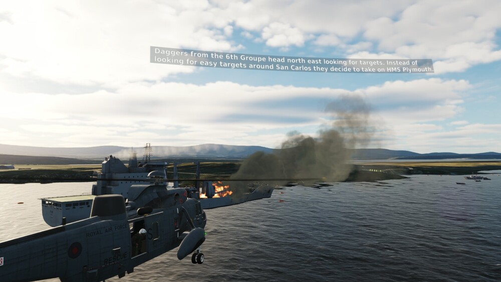 Hi everyone, I've been working on a mission in DCS based on the Falklands Conflict I original produced back in 2018, https://www.digitalcombatsimulator.com/en/files/3102536/, specifically focusing on the air defence of British ships during the attack on RFA Sir Galahad and RFA Sir Tristram at Bluff Cove. The mission centers around a CAP (Combat Air Patrol) flown by British Harriers as they protect the fleet from Argentine air attacks. Link: https://www.digitalcombatsimulator.com/en/files/3340462/ V2.6 I also want to thank all the other creators of the Mods I've used to create this mission (listed below). Mission Overview: Time Frame: June 8, 1982 Aircraft: Sea Harriers from No. 800 NAS Objective: Provide air cover for the British fleet and engage incoming enemy aircraft. Key Events: Includes coordination with HMS Intrepid SAR operations for downed pilots, and ongoing naval bombardment at Mount Kent and Stanley. Scenario: Harrier pilots Flt Lt Morgan and Lt Smith engage four A-4 Skyhawks and ensure the safety of British ships in a high-pressure combat environment. Current Features: Custom dialogue with radio calls between pilots, HMS Hermes, HMS Intrepid, Pilots and SAR units. Dynamic enemy air attacks, requiring strategic response from the player. Naval bombardment in progress, adding an extra layer of complexity to the mission. As close as I can find out to true events ,weather and units. Required Mods: HMS Hermes 1971 and 1981 v2.5 https://www.digitalcombatsimulator.com/en/files/3335915/ Civilian Assets Pack - Navy A-4E-C Royal Navy Sea King PUCARA IA-58 FMA ARGENTINA SAM Sites Asset Pack HighDigitSams Royal Navy / RAF AV-8 Pilot Helmet - https://www.digitalcombatsimulator.com/en/files/3309397/ AU Daring Destroyers - https://www.digitalcombatsimulator.com/en/files/3313017/ Civilian Aircraft mod - https://www.digitalcombatsimulator.com/en/files/3335287/ Landing Craft Unit (LCU-1627) - https://www.dropbox.com/s/y37foqfxkezgd4i/LCU-1627.zip?dl=0 Sandown Class Mine Hunter - https://www.digitalcombatsimulator.com/en/files/3338677/ DCS WWII Assets Pack - https://www.digitalcombatsimulator.com/en/shop/modules/wwii_assets_pack/ Skins: A 4 FAA IV Brigada: - https://www.digitalcombatsimulator.com/en/files/3315626/ HMS Hermes Harrier - https://www.digitalcombatsimulator.com/en/files/3339762/ HMS Invincible Harrier - https://www.digitalcombatsimulator.com/en/files/3339763/ Mirage F1CE Aerges Camo A-4 Second Wave FAA V Brigada 240: https://www.digitalcombatsimulator.com/en/files/3315626/ KC-130 FUERZA AERA AGENTINA https://www.digitalcombatsimulator.com/en/files/3300608/ What's Still in Progress: Fine-tuning enemy aircraft behaviour to create more dynamic engagements. Adding more interactive voiceovers to enhance immersion. Search and Rescue (SAR) standby for potential emergencies. Balancing difficulty to ensure both seasoned pilots and newer players can enjoy the mission. Creating a multi-player mission. CombatFlite integration. Ground force voice overs Create a lite version (Less Mods) Known Bugs: Game crash if F2 is pressed to soon at mission start. ok after 5 seconds Wingman can sometimes hit the rear of your aircraft if you leave your parking spot too soon. Feedback Needed: AI behaviour: Any suggestions on improving enemy AI aggressiveness and tactics would be appreciated. Voiceover/Dialogue: I’m working on adding more authentic radio chatter. If anyone has tips on making it sound more realistic or tools for text-to-speech, I’d love to hear them. Mission Flow: Is the pacing of engagements and tasks smooth? Does the mission keep you engaged without feeling overwhelming? Units: Are the skins correct and units correct I would really appreciate any feedback, whether it’s about bugs, mission flow, or ideas for improvement. This mission is still a work in progress, so any suggestions will help me refine it into something great for the community. Thanks in advance for your help, and feel free to download the mission and try it out! Link: https://www.digitalcombatsimulator.com/en/files/3340462/