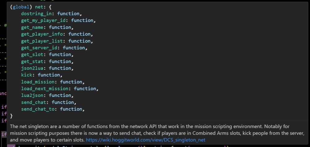 DCS Scripting API Prototypes — TGFB Edition info This utility allows for more efficient and cleaner code so, help you make better scripted missions! With this you will gain the ability to lookup and see all functions available to you in the DCS Mission Scripting API. You will get function auto-completion so you will always know what param a function wants/needs. It will also warn you for sketchy nil and Mission Scripting errors so my advice if you see a "warning" in your file you better check that out and fix it to prevent bugs and unintended fun!! The original idea as far as i can see was from 'asherao' Installation and download -> HERE TGFB Info Website: tgfb-dcs.com Discord Feel free to join the TGFB Discord or visit or website to stay up-to-date with my latest projects, mission and tools Enjoy using this tool!! This tool is updated for DCS version : "2.9.19.13478" Credit : - Hoggit Discord - asherao See Screenshot EXAMPLES :
