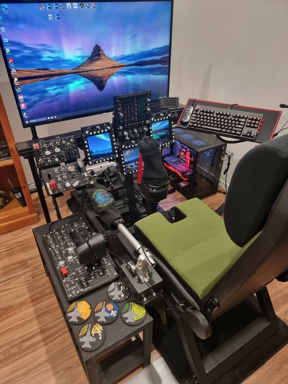 First off - I'm not an engineer , nor exceptionally smart - so I had to lean heavily on this awesome community for inspiration and help. And trust into the motto: " just start and figure it out as we go" Big shout out to @Bog9y and @Xpendable- who've been an amazing helpers and gave me loads of feedback and input. Also to @sea2skyfor the general idea of creating a generic cockpit, that doesn't have to be suuuuper detailed and usable for multiple applications. I started with the typical setup some of us have - 2x Cugar MFDs and a small Numpad in the middle as my desk setup - it's easily built up and easily removed. As I played more and more, and also began to fly more serious ( thanks TAW JTF88 !) my setup stayed built up more and longer - and I wanted to make things more realistic and playable. I started building @obious designed AV8B UFC as well as @FoxDelta After that was done, soon I saw @sea2sky generic F18 cockpit , and I wanted to design something similar - generic but rooted in the AV8B. I learned how to use Shapr3D ( Fantastic Ipad app, if you have the iPencil as well) and designed the cockpit in it. I wanted it to be a small profile / small footprint type of simpit, that I could move around - hence the setup with the rollers and the "platform" that goes just up to the seat. The side panels are moveable as well, so that you can get it all together From this it went to a local CNC shop, got the wood adjusted it and painted it - and through the different building stages we ended up with this: things I still want to do short / mid term: 3 WinWing MFDs, 1 WinWing takeoff panel built in Throttle built into the left panel Figure out storage for my keyboard and kneeboard when not in use Glare shield Better seat solution Questions?Tips ? Comments? let me know €dit: Embed fail...will upload hi res pics once I find the will to do it all again