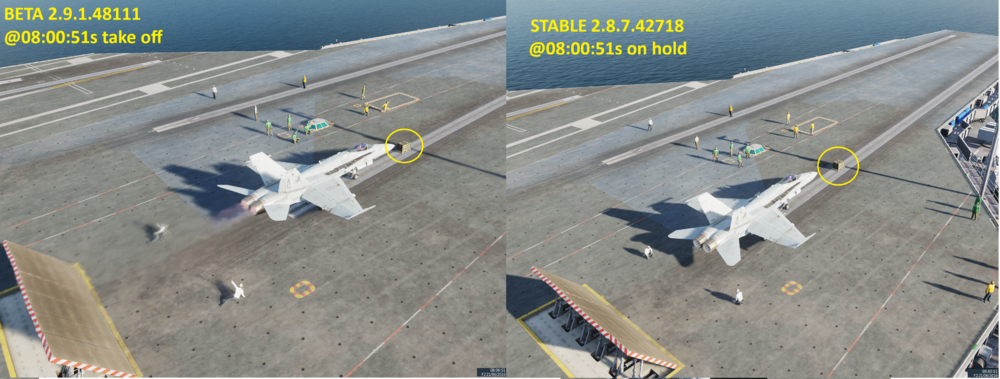 Hi all... The block AI from taking off trick, using a static object placed in front of the unit, no longer seems to work under 2.9. A mission I've written uses the static object trick to prevent the launch of "Rooster", waiting engines hot at a catapult, until certain conditions are met. This worked great under 2.8, "Rooster" would launch when required by removing the static object, but under 2.9 "Rooster" takes off immediately. To test the issue I've created a stripped down mission on the Caucasus map that contains: CVN-74 F/A-18 an ammo crate placed on the catapult track to stop the F-18 from launching No changes were made to the object properties just dragged and dropped them onto the map. On the latest stable (2.8.7.42718) the ammo crate blocks the AI F-18 from taking off. On the latest beta (2.9.1.48111) the AI F-18 launches 51 seconds into the mission. Tested open beta with mods removed, only extras installed are plane liveries. Haven't spotted anything in the open beta change logs that states the blocking behaviour has been altered, also searched the forums and didn't find anything. Is this a known problem or feature change? Anybody else confirm the issue? Many thanks for reading P.S. Although 1st post been around since LOMAC onwards LensLok85 - FA-18 - Block catapult take off.miz
