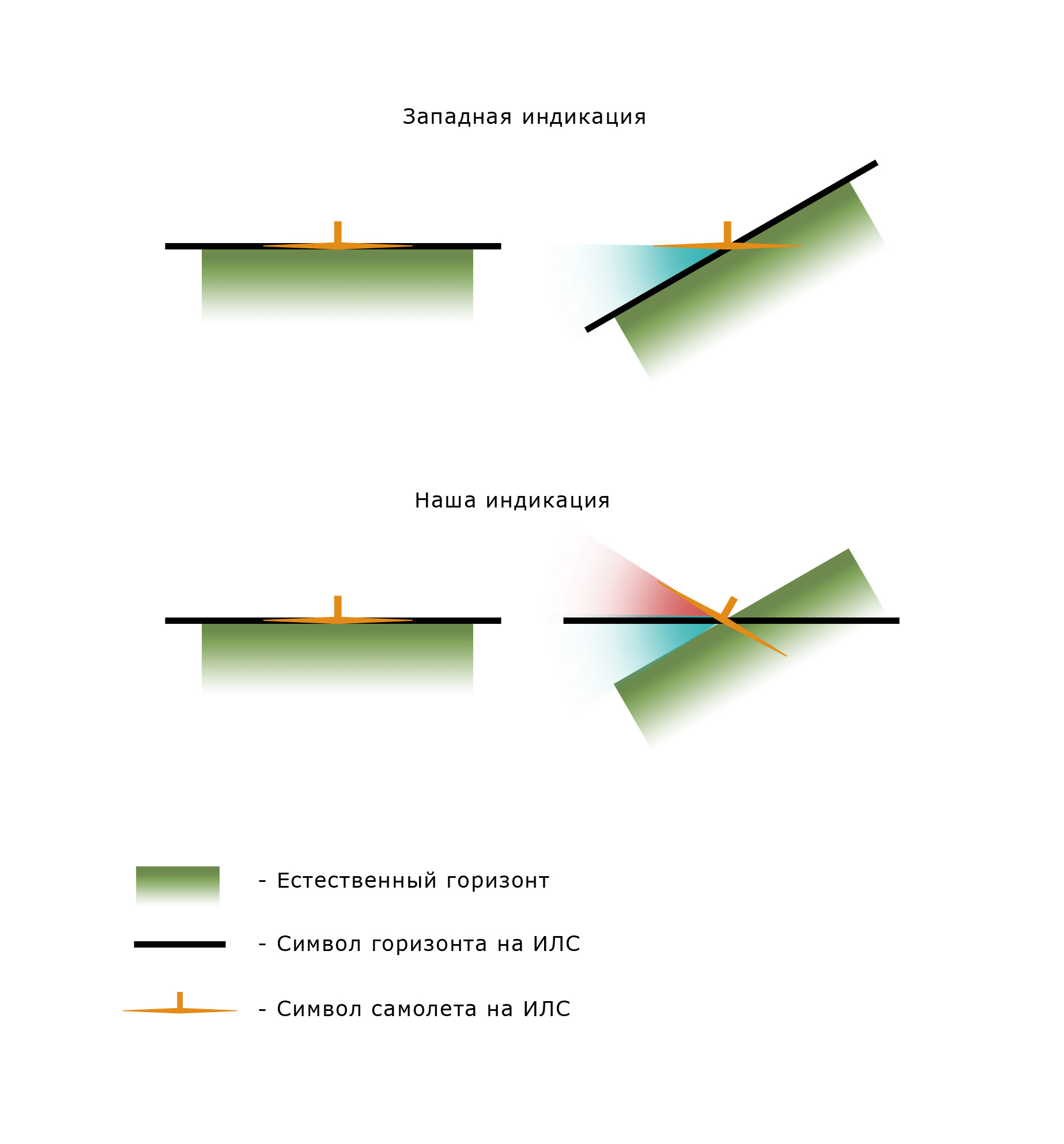 significant Posted August 21, 2009 Author Posted August 21, 2009 (edited) Я схематично нарисовал "наш" подход обозначению горизонта и "американский". Это не ИЛС конкретных самолетов, а только концепция, прошу иметь ввиду. Когда летим ровно, красота и у "нас" и у "них". Линия, обозначающая на ИЛС горизонт (на схеме условно черная) совпадает с линией естественного горизонта. И без слов понятно - крена нет. Дальше, становимся в правый вираж. У американцев все просто - линия горизонта на ИЛС вместе с линией естественного горизонта наклоняются и угол между ними и неподвижным(!) символом самолета обозначает крен. Что происходит с "нашим" ИЛС? Линия естественного горизонта уплывает против часовой стрелки, подвижный символ самолета - по часовой стрелке. Получается визуальная каша - три разъезжающихся в разные стороны линии. На лицо, первое - избыточность геометрии индикации. Второе - естественный горизонт и символ самолета начинают отклонятся в разные стороны, внося панику в ряды летчиков:) Fisben, пожалуйста, прокоментируй мои соображения. Исходя из этого можно дальше дискутировать какие символы нужны по центру ИЛС. Edited August 21, 2009 by significant