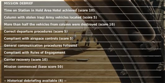 KENNY1988 Posted Friday at 05:02 PM Posted Friday at 05:02 PM (edited) Hi @Nix Mills, may I ask you about scoring system in mission 10? I've just flew it and scoring was 95, see below. Do you know, where could be the last 5 points? I had to report Winchester. These 5 points are for not destroy of all targets? I think BTR survived my attack. P.S. When I'm returning after convoy is destroyed to Broadway, in kneeboard is written altitude 28, but in dialogue by Player is 26. Which altitude is correct? Thank you in advance, Flying KENNY null Edited Friday at 07:30 PM by KENNY1988 1