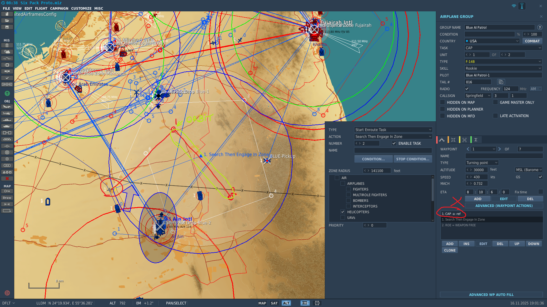 Miccara Posted October 31 Author Posted October 31 On 10/26/2025 at 8:42 AM, silverdevil said: hello. can you share the MIZ you are using? if it is a big mission with a lot of units, give some specifics of the flight in question. Here is the file. It's a work in progress and i can't get the Blue AI Patrol Secondary, Blue AI Patrol, Blue AI Patrol 2, same names on the Red side (e.g. Red AI Patrol 2), to stay inside the patrol area. Any help would be greatly appreciated. Sorry for the delay in responding! Six Pack - incomplete.miz 13 hours ago, 2circle said: Make sure you have any task such as CAP or SWEEP deleted from the list of tasks and only have the search and engage task enabled (with whatever the enabling condition is - if there is one). The AI will disregard any limitations on the "search and engage" enroute task if there is a task such as CAP enabled. Tried that. Still seems to be an issue.