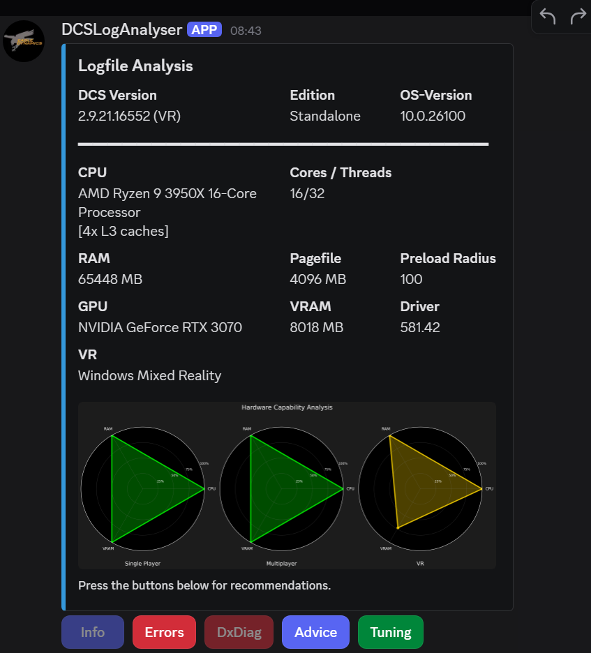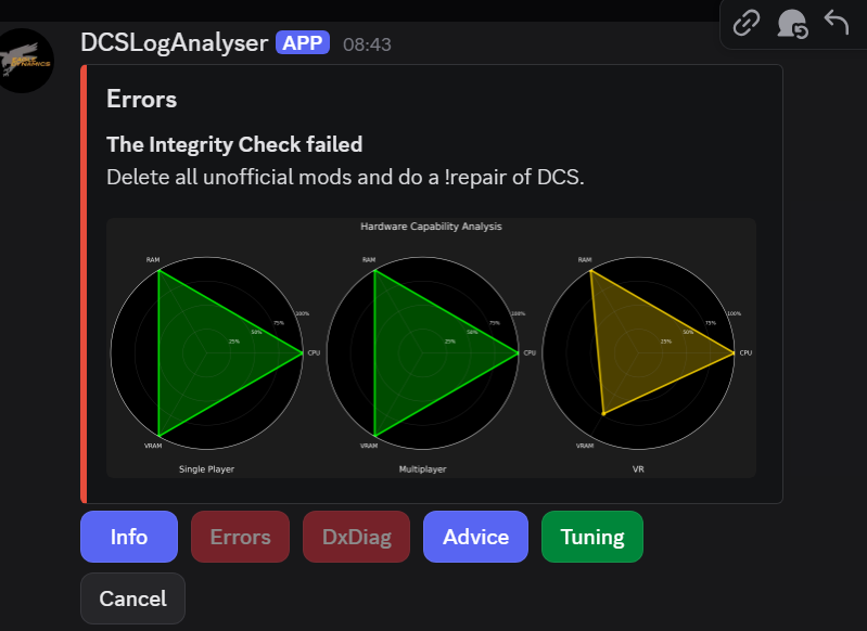 I ran it through DCS logbook analyzer discord and thats what it came back with (fails integrity check) , mods usually means third party unofficial additions to the DCS game folder, though some badly behaved mods in saved games can also screw you around.  If you haven't got anything, try a slow repair anyway it won't cost you anything and might repair a damaged file
