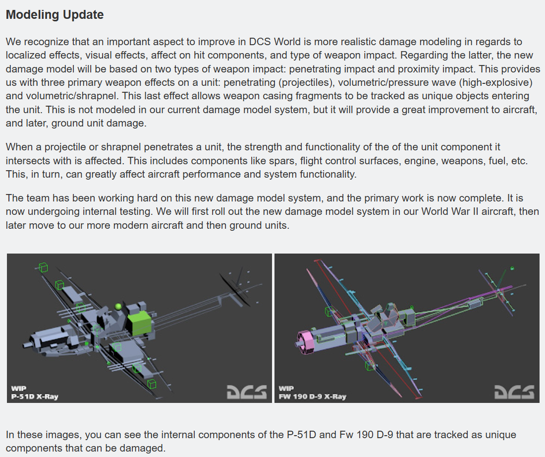 mostevil Posted yesterday at 07:34 PM Posted yesterday at 07:34 PM As someone who flys a lot of WWII and has done a fair bit of game engine development, if all that is designed in, it just isn't working at all in practice. HE/Frag Flak should be a shrapnel effect but it seems to be treated as a HE blast, anything in the radius gets damaged, if it's close enough you take damage to every surface and every part of the engine at once, yet weirdly the pilot is almost always totally fine (see below). It's all or nothing from a frag blast, when it should be like a shower of light frag, ironically the most danger is to the pilot. With everything using the shilka algorithm they also all get modern radar gunnery, even through cloud without any kind of radar director, that can make it crazy effective as direct AAA too. Real flak direction was horribly ineffective needing thousands of rounds and area saturation per kill. (although late war allies did get radar flak, usually on warships 5" secondary batteries) Penetration The AP 20mm just don't penetrate, if you hit the tail it shows damage to the tail, hit the wing, regardless of angle, hole in the wing (doesn't do much). If you fire up into the engine or kick the rudder to shoot in from the side it will fairly easily knock out the engine but it I've not seen it penetrate through the aircraft to the engine as a 20mm AP easily can. The seat armour in the german fighters can just stop 0.50cal, a 20mm can penetrate and turn a chunk of that armour into shrapnel. The pilot wouldn't survive. An unspotted bounce was just as deadly from a SpitfireIX as from a 109k4. But you need to hit from specific angles to make it do anything in DCS. We rarely see those rear/underseat tanks get punctured or ignite when hammering the rear of aircraft that have them. Self sealing tanks only do so much, with allied incendiary rounds in tests detonating those around 30% of the time (some cool guncam footage out there). It'd self seal vs machine gun calibre ball, AP or frag, but only up to a certain size, it shouldn't self seal a 20mm hole. Rear Damage Cheese Top axis players in pairs have a strategy of just ignoring fire from the rear to drag even for very close in aircraft if they have friends nearby because of this, one 30mm will end the allied aircraft before the 20mm can destroy him (if at all). Often they don't even need to go home or fall behind after this. I've been able to ignore hundreds of hits from the rear in 109's as I run. If they're out of 20mm there's no danger at all. That close 6 position is an almost guaranteed kill in reverse. It's clearly not correct. HE is much more powerful as it effectively ignores armour. Wherever it hits anything in the radius gets damaged. Negating armour. The opposite of how it should work, armour is strong vs non-AP damage. The german HE/frag was strongest against wooden soviet aircraft. The 30mm admittedly is big enough that tails coming off isn't unreasonable. Spar Damage But 20mm hispano to the wing root should equally weaken the wing spars enough that the wing would be off under most flying conditions. In thousands of hours I've only seen wings come off the Spitfire. And I think that's usually just an effect of it being very sensitive to pulling more than 5g at >400mph rather than damage. I'm also not totally convinced the german MG's aren't being treated as HE rather than the micro frag damage the really do. Skin damage creates some instability but doesn't noticably affect speed. The drag penalty from all the holes we see in a fuselage should be very signifcant. Small aerodynaic differences make large max speed differences, so a big holes or even lots of little ones should be bad. Pilots Pilots kills are extremely rare even with masses of clear hits down into cockpits from or through the sides have no effect at all most of the time. Even 303's have no trouble penetrating glass and thin side walls or pilots, but in the game we joke they're just BB's for tickling. The only ones I commonly see are on the Anton. Other aircraft pilot kills are basically never happening. So the pilot hit box is tiny, isn't working most of the time or the glass/side skin is stopping them for some reason. Ground units Ironically the same guns are very effective at longer ranges vs much more heavily armoured ground units than they are vs fighter aircraft. I don't think it's so much that the 20mm hispano needs a buff, I think penetration isn't being modelled and things that are actually frag are being handled as HE pressure radiuses because the shell is called HE. The damage model you describe just isn't working. Are we pretending this doesn't go through a light fighter? 4 1
