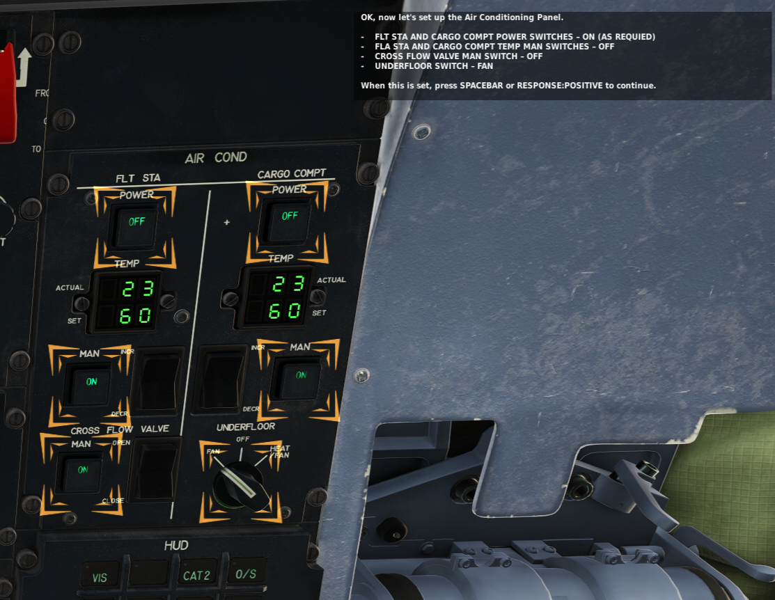 dresoccer4 Posted 22 hours ago Posted 22 hours ago The tutorial says you need to turn on the FLA STA and CARGO COMP air conditioning. I pushed the main power buttons but they stayed in the 'off' position. The other switched did come on as shown in the screenshot. Is there another step I missed you need to complete before you can turn the main power switches on? null Acer Predator Triton 700 || i7-7700HQ || 512GB SSD || 32GB RAM || GTX1080 Max-Q || FFB II and Thrustmaster TWCS Throttle || All DCS Modules