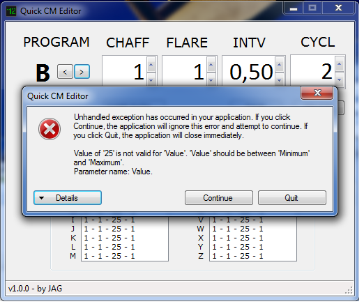 JAG Posted December 4, 2010 Posted December 4, 2010 (edited) Hi guys, I want to introduce you this little application that allow you to create easily and quickly your program configurations for the countermeasure system. Instructions: - First make a backup of the file an_ale40v_params.lua located in \Eagle Dynamics\DCS World\Mods\aircrafts\A-10C\Cockpit\Scripts\AN_ALE40V\device\ - .Net Framework 4.0 needed - Extract the files - Run setup.exe - Start the application and click Game Path button - Select the Main Folder of the game Click Ok and that's all, you're ready to start creating your own countermeasure programs. As promised here is the updated version: :pilotfly: CHANGES IN v1.3.0 -Compatible with DCS A-10C v1.2.0 CHANGES IN v1.2.0 -Fix the decimal separator bug in interval numeric box If you find any bug, report it, and I'll fix it as soon as posible. Hope you like it guys :thumbup: Saludos Quick CM Editor v1.3.rar Edited August 11, 2012 by JAG 22 Quick guide to configure ABRIS and LCD mini monitor Quick Countermeasure Editor v1.3.0 Core i5 3570K 4.0Ghz | GIGABYTE MOTHERBOARD | Crucial M4 120GB | 8GB DDR3 1600 MHZ | ASUS GTX 670 | AOC LED 23" | AOC LCD 24" | HYBRID DUAL THROTTLE (SAITEK THROTTLE QUADRANT + SUNCOM DUAL THROTTLE) | CH FIGHTERSTICK | SAITEK PRO PEDALS |