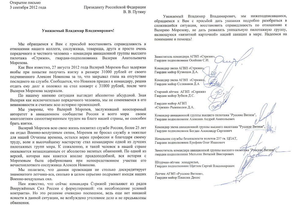 Wildcat19 Posted September 3, 2012 Posted September 3, 2012 "Москва 3 сентября. INTERFAX.RU Командир пилотажной группы "Стрижи" полковник Валерий Морозов, которого подозревают в злоупотреблении служебными полномочиями, будет уволен с военной службы. "Из министерства обороны пришла телеграмма, в которой говорится, что полковник Морозов до 5 сентября будет уволен с военной службы из-за несоблюдения условий контракта", - сообщили "Интерфаксу" в понедельник в Центре показа авиационной техники имени" http://www.interfax.ru/society/txt.asp?id=263544 Не важно кем быть и кому подражать! Важно бить, важно поражать!