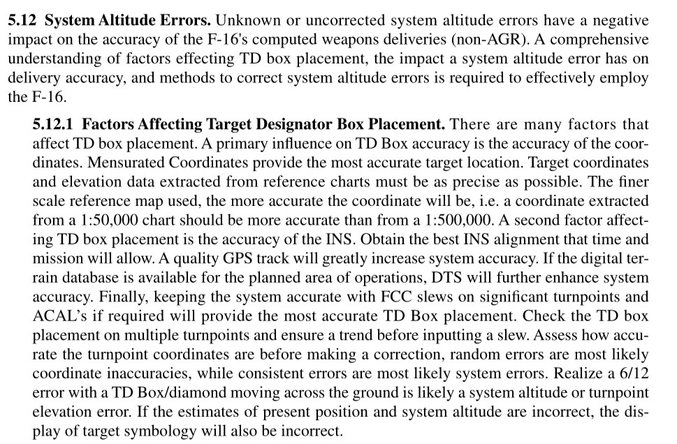 Наскольку помню у Вайпера есть понятие системной высоты System Altitude и расчеты ведуться относительной ней, детали, в F16 VOL 5 от 1996 года и KAFTTP3-3v5 (Корейская и Американская версия), доки публичны, значение SA корректируется GPS, FCR, RALT, HUD и TGP, коррекция по GPS постоянно. Она, SA связана с цифровой картой которую подгружают из картриджа, по факту известна всегда высота под самолетом.1 point